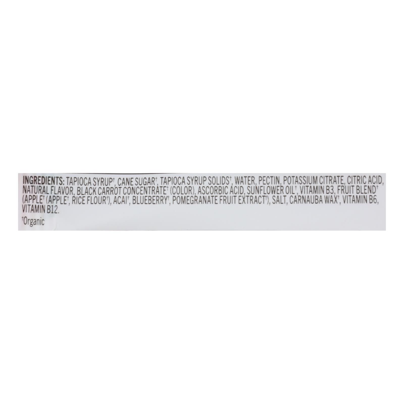 ingredients : organic tapioca syrup;organic sugar;organic tapioca syrup solids;pectin;citric acid;potassium citrate;natural flavor;color added;organic black carrot concentrate;ascorbic acid;organic fruit blend;organic apple powder;organic acai powder;organic blueberry powder;organic pomegranate powder;vitamin blend;vitamin b3;b6 and b12;sea salt;organic sunflower oil;carnauba wax