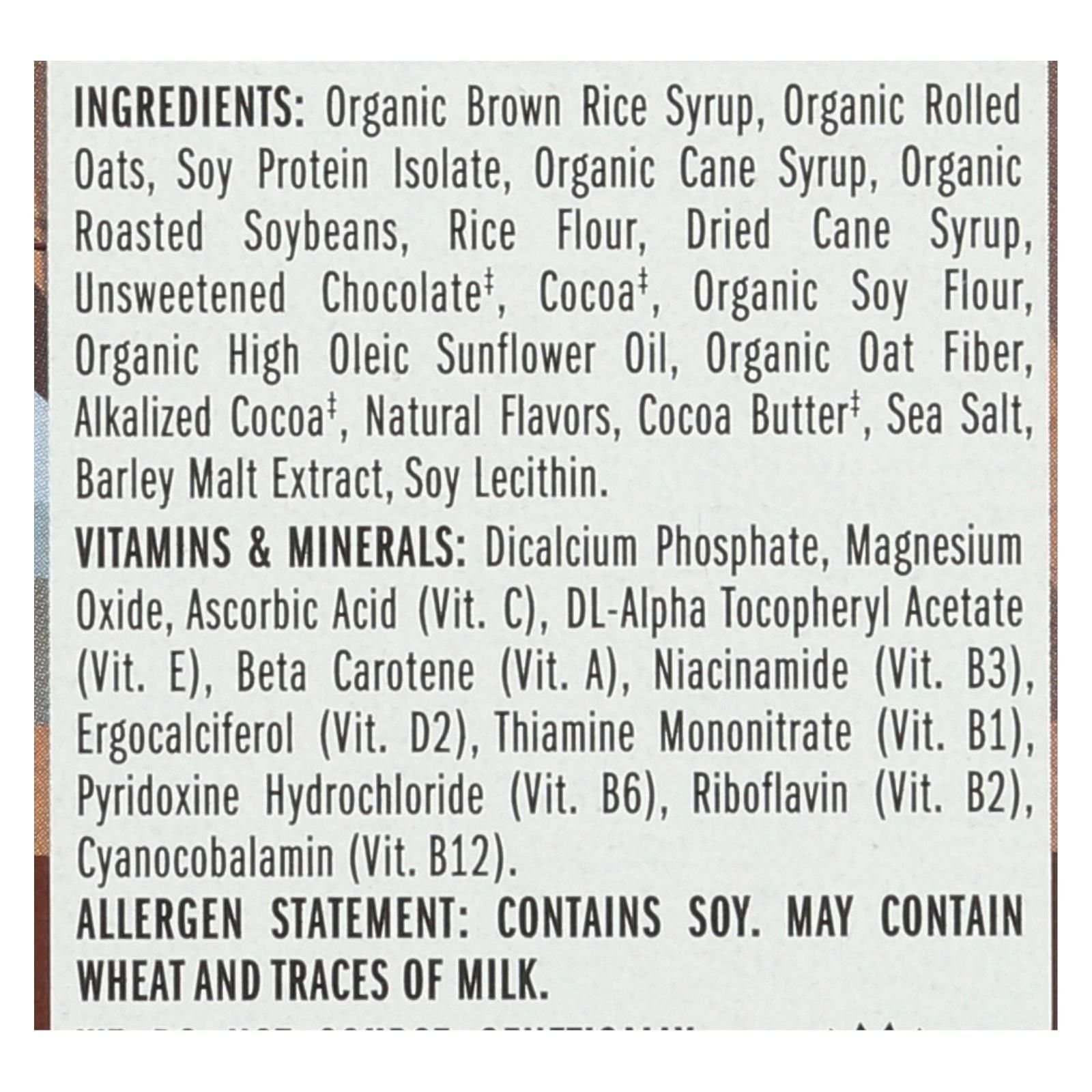 ingredients : dicalcium phosphate;magnesium oxide;ascorbic acid;vit. C;dl-alpha tocopheryl acetate;vit. E;beta carotene;vit. A;niacinamide;vit. B3;ergocalciferol;vit. D2;thiamine mononitrate;vit. B1;pyridoxine hydrochloride;vit. B6;riboflavin;vit. B2;cyanocobalamin;vit. B12;organic brown rice syrup;organic rolled oats;soy protein isolate;organic cane syrup;organic roasted soybeans;rice flour;dried cane syrup;unsweetened chocolate ;cocoa ;organic soy flour;organic high oleic sunflower oil;organic oat fiber;alk