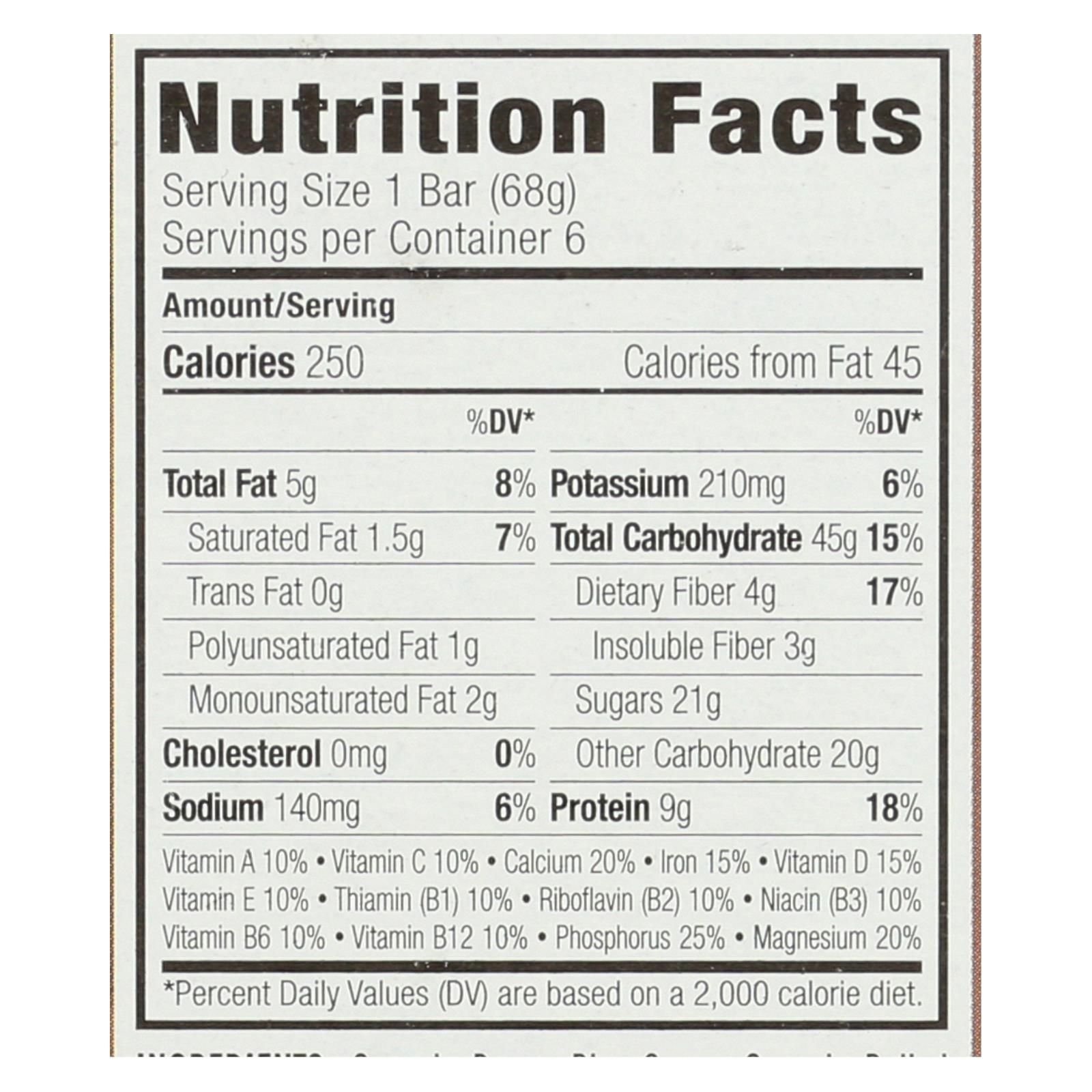 ingredients : dicalcium phosphate;magnesium oxide;ascorbic acid;vit. C;dl-alpha tocopheryl acetate;vit. E;beta carotene;vit. A;niacinamide;vit. B3;ergocalciferol;vit. D2;thiamine mononitrate;vit. B1;pyridoxine hydrochloride;vit. B6;riboflavin;vit. B2;cyanocobalamin;vit. B12;organic brown rice syrup;organic rolled oats;soy protein isolate;organic cane syrup;organic roasted soybeans;rice flour;dried cane syrup;unsweetened chocolate;organic soy flour;organic oat fiber;organic high oleic sunflower oil;cocoa butte