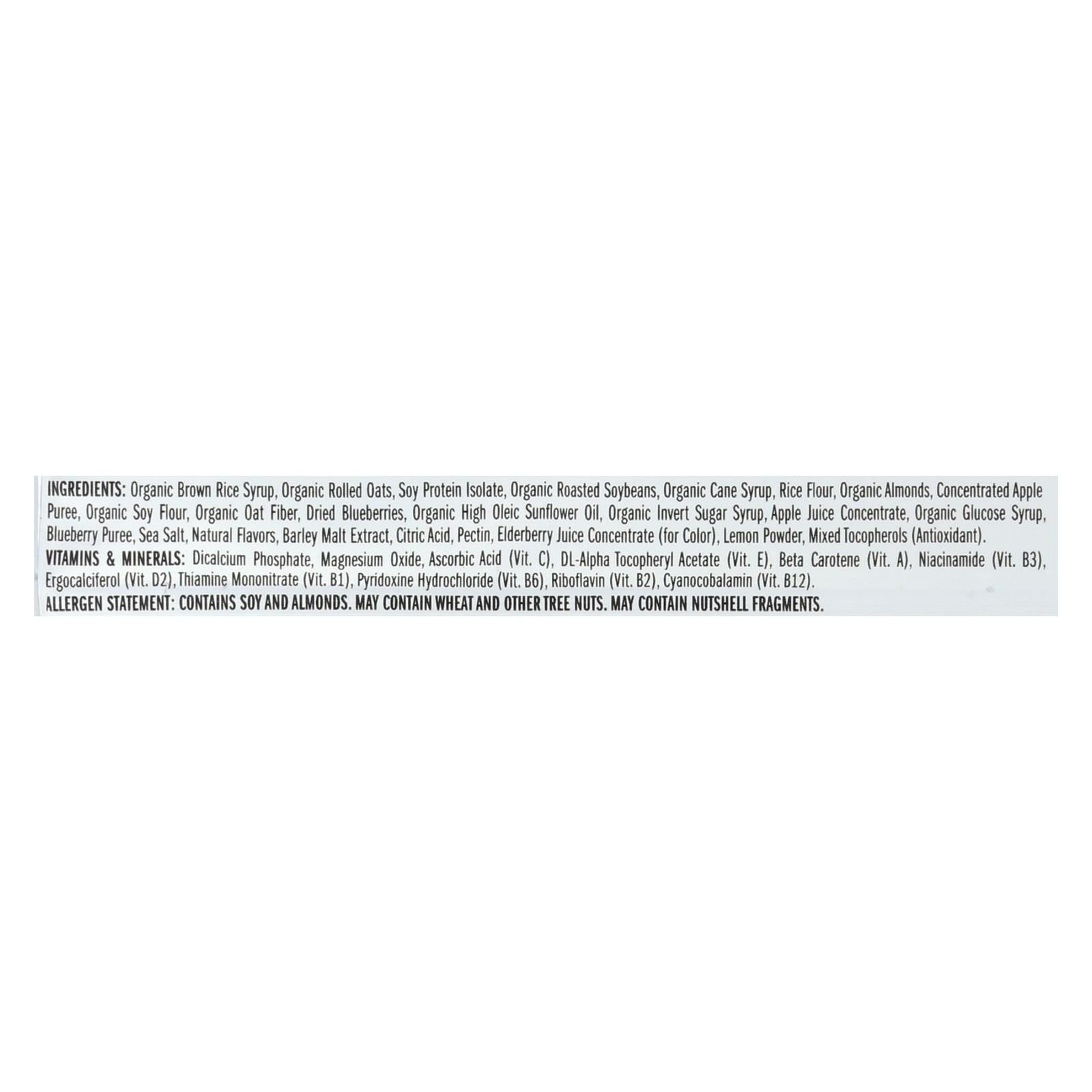 ingredients : organic brown rice syrup;organic rolled oats;soy protein isolate;organic roasted soybeans;organic cane syrup;rice flour;organic almonds;concentrated apple puree;organic soy flour;organic oat fiber;dried blueberries;organic high oleic sunflower oil;organic invert sugar syrup;apple juice concentrate;organic glucose syrup;blueberry puree;sea salt;natural flavors;barley malt extract;citric acid;pectin;elderberry juice concentrate;for color;lemon powder;mixed tocopherols;antioxidant;vitamins & mi