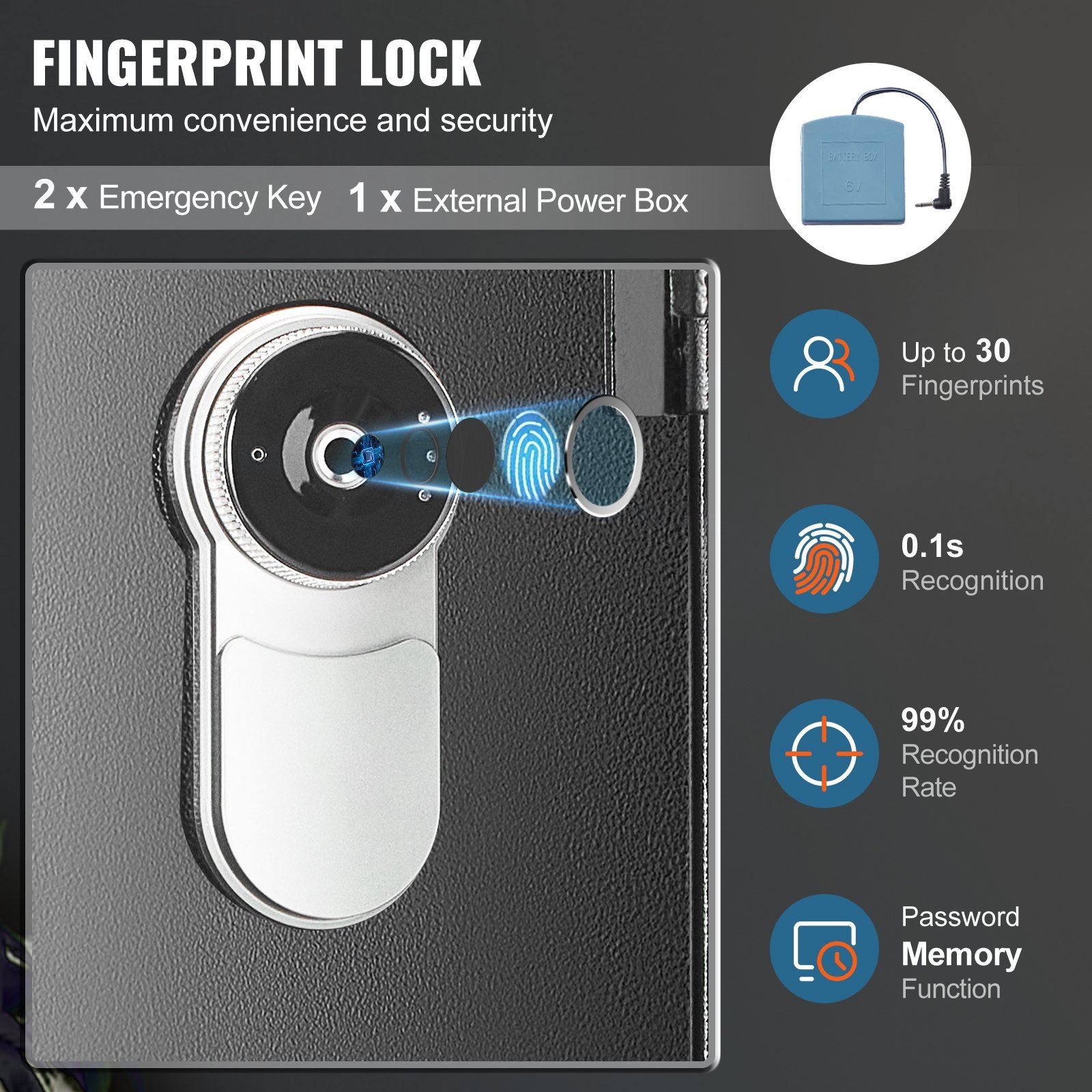 3.Smart Fingerprint Lock: VEVOR long gun safe features a smart fingerprint lock for quick and secure access in just one second. You can register up to 30 fingerprints for easy access. In case of emergency, the safe also includes two emergency keys and an external charging box, so you never have to worry about the battery running out.